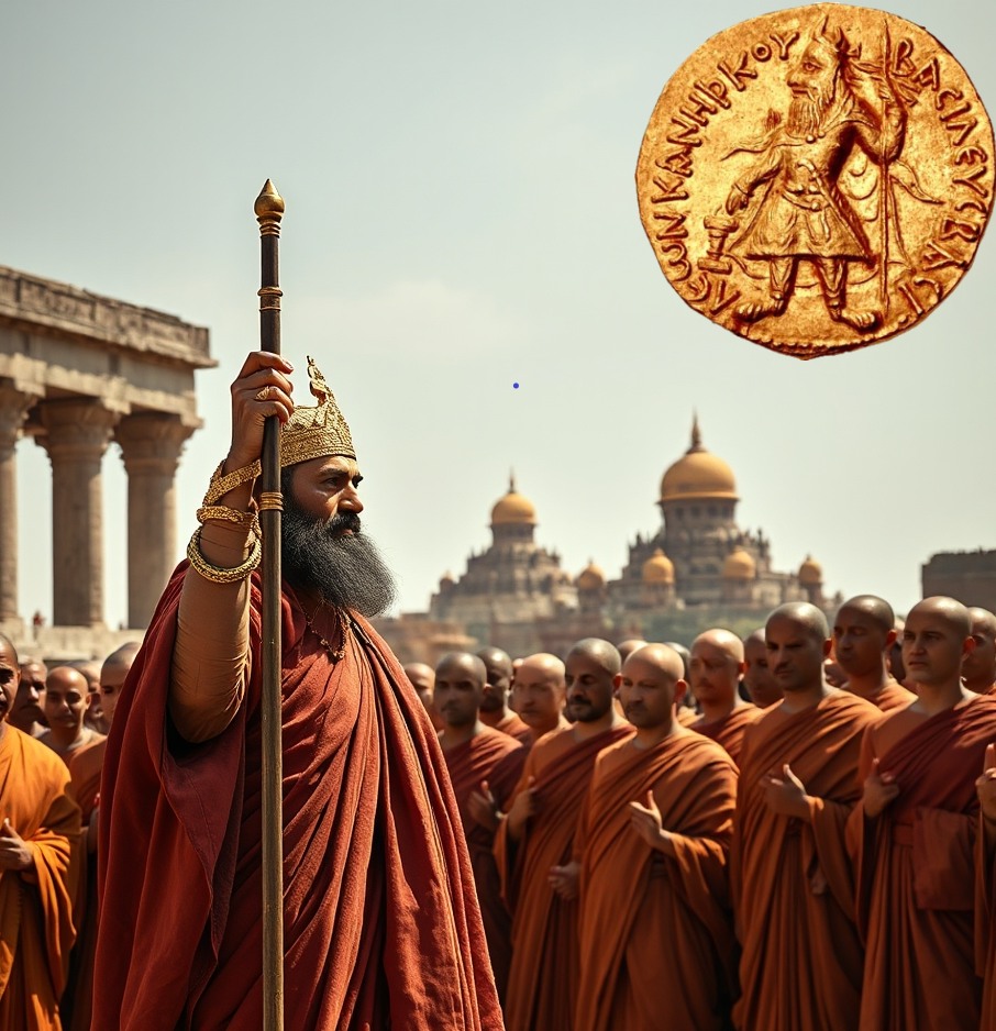 ภาพในจินตนาการ พระเจ้ากนิษกะ สมเด็จพระจักรพรรดิแห่งจักวรรดิกุษาณะ พร้อมหมู่ภิกษุในกัศมีระ พระเจ้ากนิษกะทรงครองผ้ากาษายะสำหรับฆราวาส ก่อนที่จะทรงศีล เมื่อจะสมาทานศีลจะเปลื้องเครื่องทรงออก ตามแบบประเพณีในพุทธศาสนาฝ่ายอินเดียเหนือ